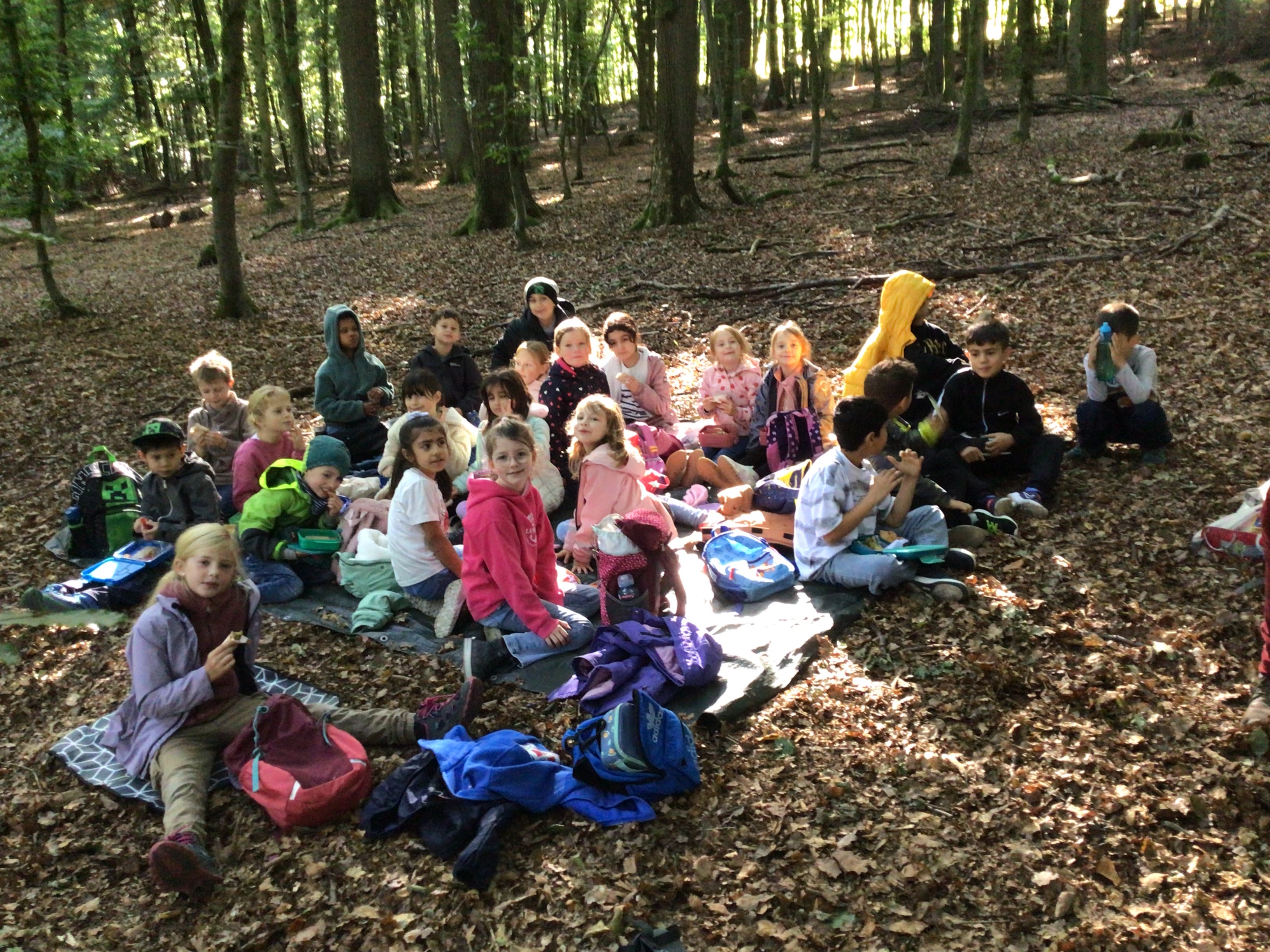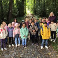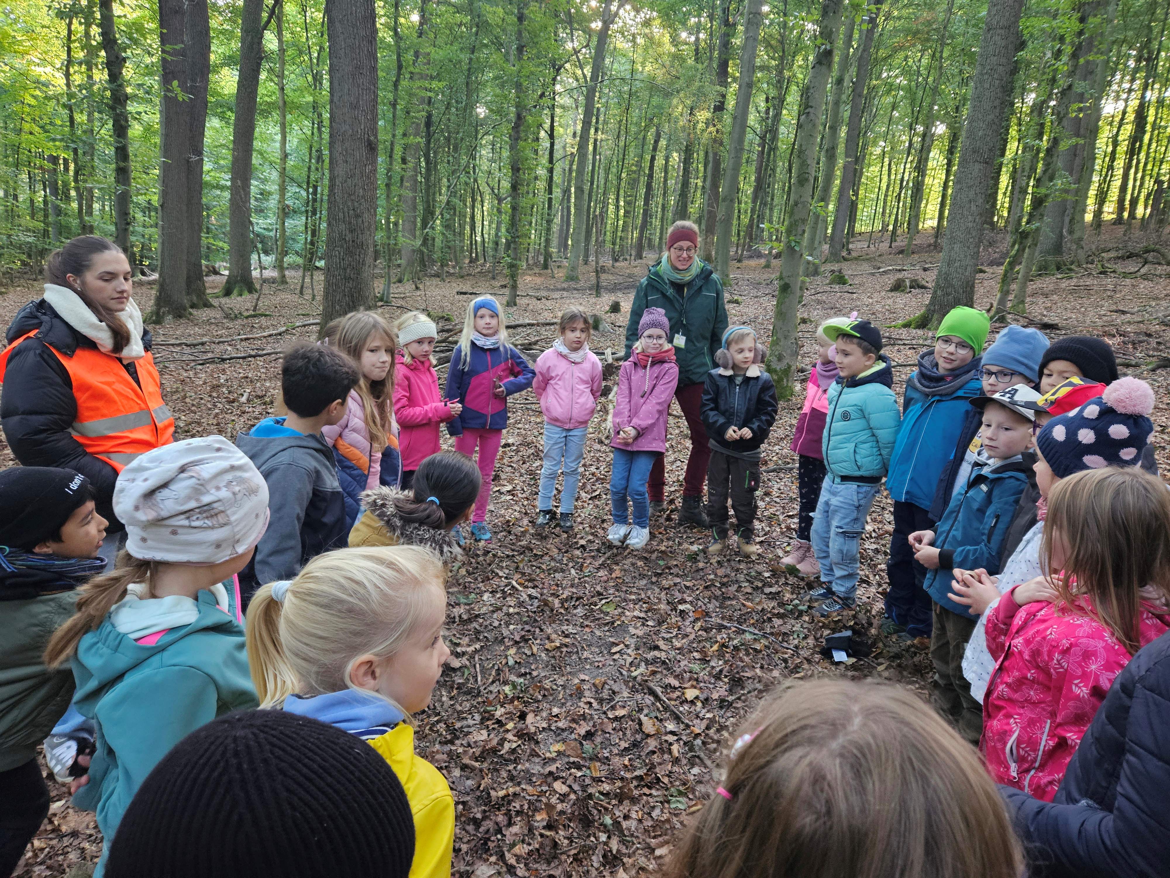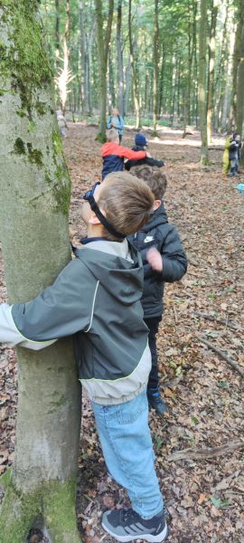 Am 23. u. 24.09.2025 ging es für die Rüthener 2. Klassen auf Erkundungstour in den Laubmischwald angrenzend an das Bibertal. Zuerst wanderten wir von der Schule bis zum Waldschiff, dort trafen wir Frau Hentschel vom Liz, die uns in den Wald führte. Nach einem kleinen Frühstück lernten wir, wie sich Eichhörnchen auf den Winter vorbereiten, wie sich verschiedene Waldfunde anfühlen, wie sich Bäume auch ohne Sehen unterscheiden lassen und fertigten Baumsteckbriefe an.
