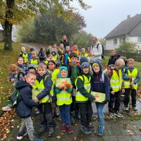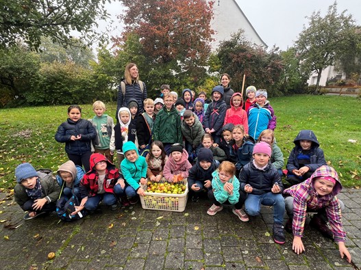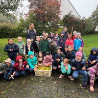 Bereits am Dienstag machten sich die Schulkinder auf den Weg zur Apfelernte im Dorfpark in Kallenhardt. Dort sammelten sie die herabgefallenen Äpfel auf.