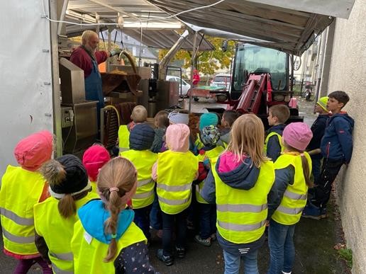 Die Kinder füllten die Äpfel in die Behälter der Apfelsaftpresse und konnten zuschauen, wie aus den eigenen Äpfeln nun frischer Apfelsaft gepresst wurde. Das Team der Mobilen Saftpresse zeigte und erklärte der Klasse die einzelnen Schritte ihrer Saftpresse. Und natürlich konnten alle den Saft schon einmal probieren.